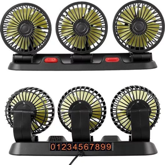 Ανεμιστήρας καμπίνας οχημάτων τριπλός – 12V. Πλήρως περιστρεφόμενες κεφαλές 360° και ρυθμιζόμενο ύψος για πολλαπλές επιλογές κατεύθυνσης αέρα. Εύκολη τοποθέτηση στο ταμπλό με ισχυρό αυτοκόλλητο διπλής όψης στη βάση. Πλήκτρο On/Off. 2 ταχύτητες. Λειτουργία με ενσωματωμένη πρίζα αναπτήρα αυτοκινήτου. Διαστάσεις συσκευασίας: 31x11x14 cm Βάρος συσκευασίας: 0,685 kgs