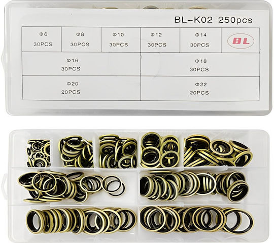 Το σετ περιλαμβάνει Μεταλλικές Ροδέλες Στεγανοποίησης και εσωτερικό καουτσούκ O-Ring με 250 τεμάχια σε 9 διαφορετικά μεγέθη. Οι ροδέλες είναι ιδανικές για στεγανοποίηση και αποτροπή διαρροών σε διάφορες συνδέσεις, προσφέροντας ανθεκτικότητα και αξιοπιστία.