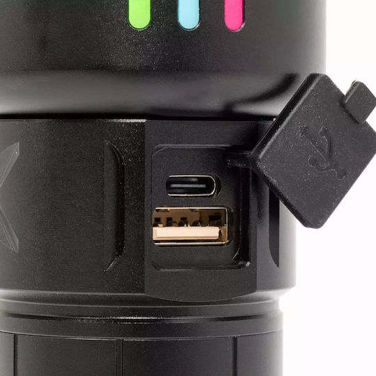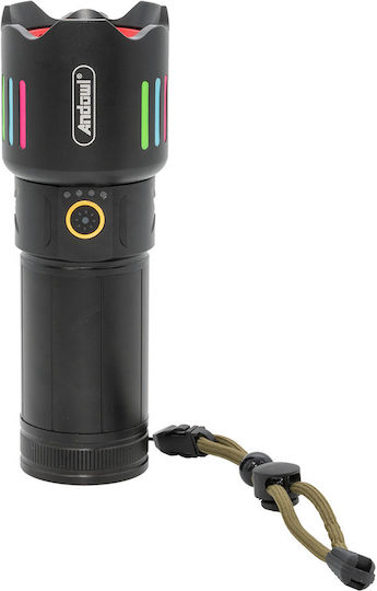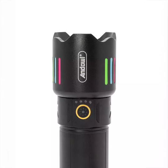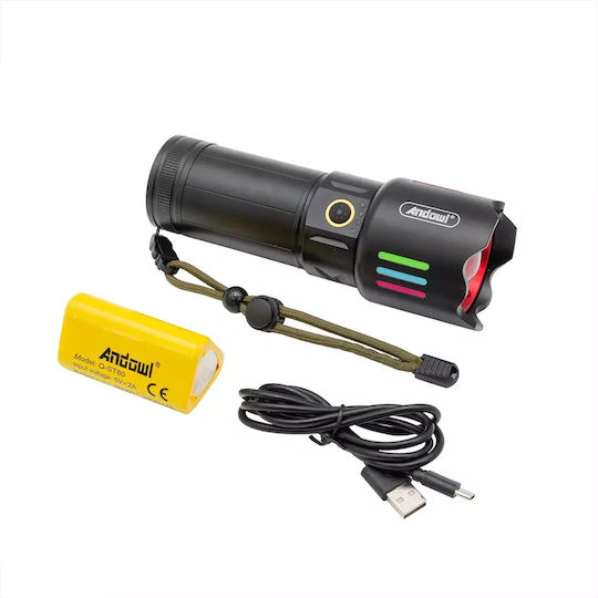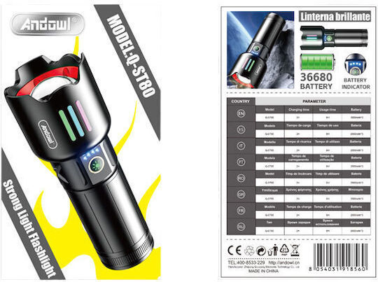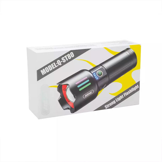 Ισχυρός Φακός Χειρός Επαναφορτιζόμενος LED Laser Andowl Q-ST80 με κράμα αλουμινίου και LED laser. Έχει ένδειξη με φωτεινά λαμπάκια για την κατάσταση της μπαταρίας.