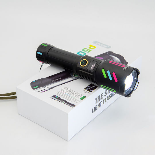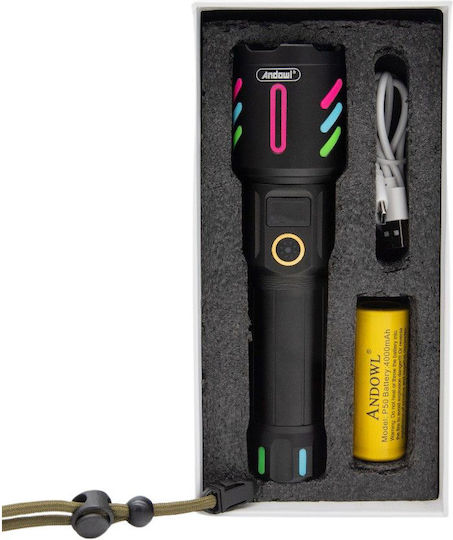 Φακός LED χειρός της Andowl, κατάλληλος για χρήση σε δραστηριότητες όπως κατασκήνωση, πεζοπορία, ποδηλασία, κυνήγι και ψάρεμα.