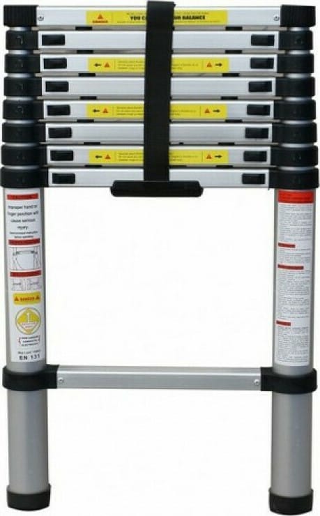 Πτυσσόμενη τηλεσκοπική σκάλα κατασκευασμένη από κράμα αλουμινίου για μεγάλη σταθερότητα και αντοχή.