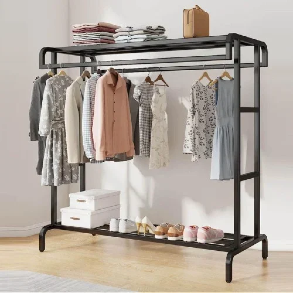Μπορεί να διασφαλίσει ότι έχετε αρκετό χώρο για να κρεμάσετε διαφορετικούς τύπους ρούχων, όπως επίσημα φορέματα, παντελόνια, μπουφάν, μπλουζάκια κ.λπ. Στο ράφι μπορείτε να αποθηκεύσετε παπούτσια, τσάντες και βαλίτσες. Το να κρατάς τα ρούχα ξεπερνά τις προσδοκίες σου.