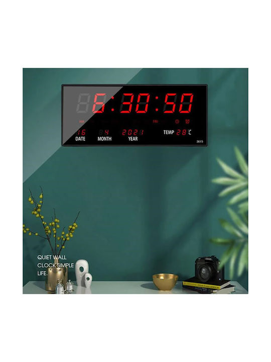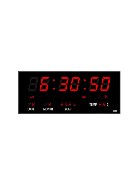 LED ρολόι τοίχου ψηφιακό σε μαύρο χρώμα με κόκκινες ενδείξεις. Είναι κατασκευασμένο από πλαστικό και τοποθετείται εύκολα στον τοίχο με βίδες. Διαθέτει λειτουργίες όπως ενδείξεις θερμοκρασίας και ημερομηνίας, ξυπνητήρι και μελωδία. Λειτουργεί με καλώδιο USB (περιλαμβάνεται) και είναι κατάλληλο για οικιακή ή επαγγελματική χρήση, καθώς είναι ευανάγνωστο χάρη στις διαστάσεις του.