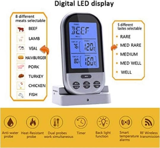 Ασύρματο ψηφιακό θερμόμετρο κρέατος με διπλούς ανιχνευτές IPX7 και μεγάλη οθόνη LCD με οπίσθιο φωτισμό. Χρειάζεται 1-2 δευτερόλεπτα για τη μέτρηση της ακριβούς θερμοκρασίας έως και 380°C, ενώ παράλληλα μπορεί να παρακολουθεί την θερμοκρασία του κρέατος σε φούρνο ή ψησταριά από απόσταση.