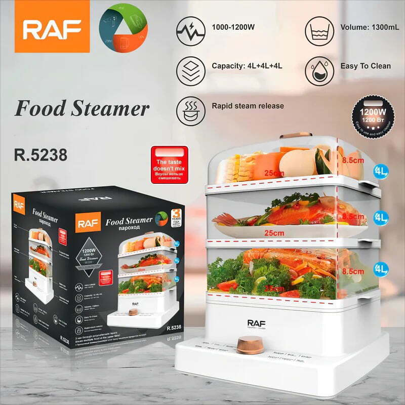 Ο ατμομάγειρας Raf R-5238 είναι ιδανικός για γρήγορο και υγιεινό μαγείρεμα με ατμό, διατηρώντας όλα τα θρεπτικά συστατικά και τις βιταμίνες των τροφίμων. Έτσι, σε κάθε φαγητό που θα ετοιμάζετε, πάντα θα διατηρούνται η γεύση και οι βιταμίνες του.