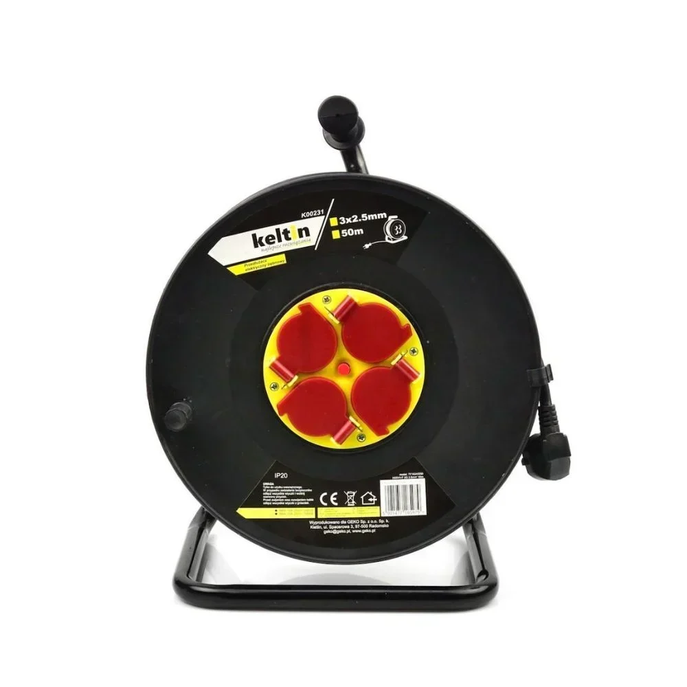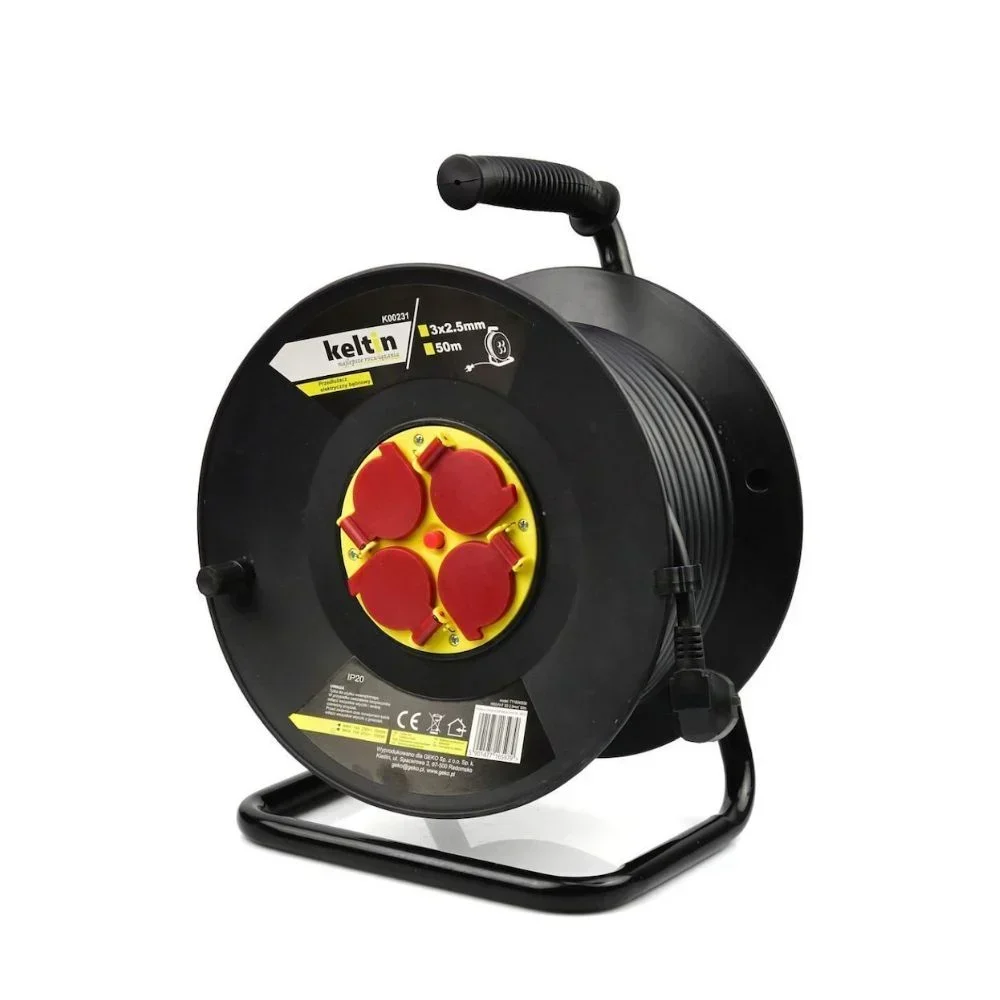 Πλαστική μπαλαντέζα σε καρούλι με θέσεις για 4 πρίζες και καλώδιο μήκους 50 μέτρων, σε μαύρο χρώμα.