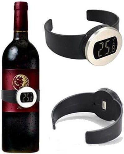 Ηλεκτρονικό θερμόμετρο κρασιού με αισθητήρα θερμοκρασίας και ψηφιακή οθόνη η οποία προβάλλει τη θερμοκρασία του κρασιού σας ώστε να απολαύσετε πλήρως τη γεύση του. Τοποθετείται απλά σαν ζώνη γύρω από το μπουκάλι και μέσα σε λίγα λεπτά μπορείτε να διαβάσετε τη θερμοκρασία στην οθόνη.