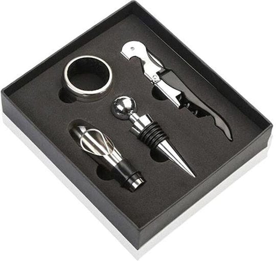 Σετ αξεσουάρ κρασιού 4 τεμαχίων, συσκευασμένο σε κομψό κουτί. Περιλαμβάνει όλα τα πιο συχνά χρησιμοποιούμενα αξεσουάρ κρασιού - χρήσιμο σε κάθε σπίτι.