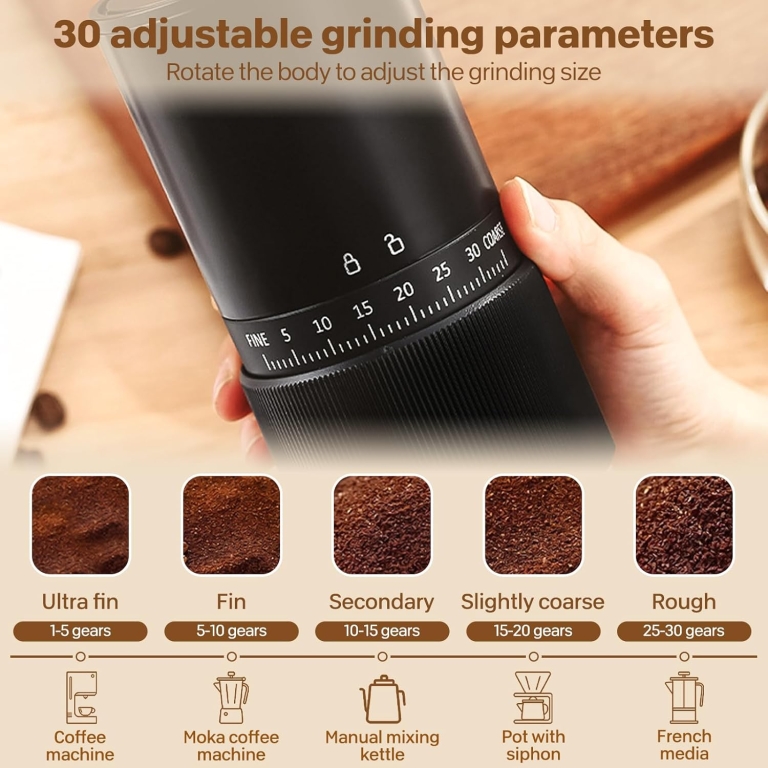 Διαθέτει 30 εξωτερικά ρυθμιζόμενες βαθμίδες άλεσης, επιτρέποντάς σας να επιλέγετε με ακρίβεια από χοντρή έως πολύ λεπτή άλεση, καλύπτοντας όλες τις μεθόδους παρασκευής όπως φίλτρου, French press, espresso, moka pot και pour over.