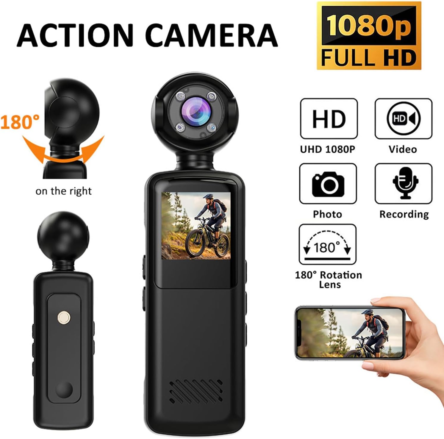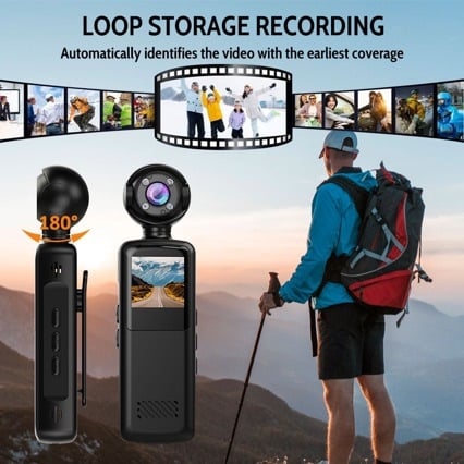 Διαθέτει περιστρεφόμενο φακό 180°, επιτρέποντας γρήγορη προσαρμογή της γωνίας λήψης ανάλογα με τη δραστηριότητα, ενώ η ενσωματωμένη οθόνη LCD 1.5 ιντσών διευκολύνει την άμεση προεπισκόπηση και τις βασικές ρυθμίσεις.